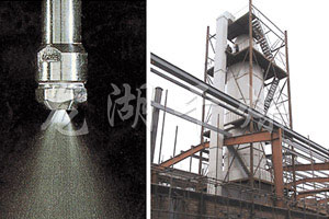 壓力噴霧干燥機(jī)工作過程為:料液通過隔膜泵高壓輸入,噴出霧狀液滴,然后同熱空氣并流下降,大部分粉粒由塔底排料口收集,廢氣及其微小粉末經(jīng)旋風(fēng)分離器分離,廢氣由抽風(fēng)機(jī)排出,粉末由設(shè)在旋風(fēng)分離器下的收粉筒收集,風(fēng)機(jī)出口處還可裝備二級除塵裝置,回收率在96%-98%。