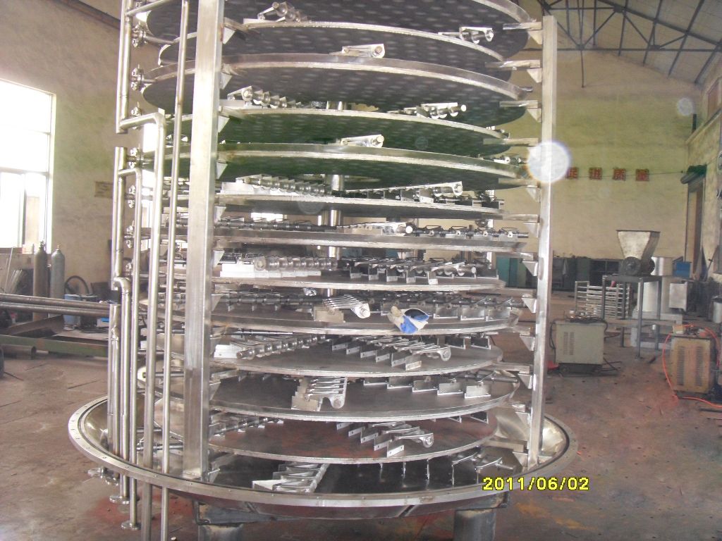 濕物料自加料器連續地加到干燥器上部干燥盤上,帶有耙葉的耙臂作回轉運動使耙臂作回轉運動使耙葉連續地翻抄物料。物料沿指數螺旋線流過干燥盤表面,在小干燥盤上的物料被移送到外緣,并在外緣落到下方的大干燥盤外緣,在大干盤上物料向里移動并從中間落料口落如下一層小干燥盤中。大小干燥盤上下交替排列,物料得以連續地流過整個干燥器。中空的干燥盤內通入加熱介質,加熱介質形式有飽和蒸汽、熱水和導熱油,加熱介質由干燥盤的一端進入,從另一端導出。已干物料從后一層干燥盤落到殼體的底層,后被耙葉移送到出料口排出。濕份從物料中逸出,由設在頂蓋上的排濕口排出,真空型盤式干燥器的濕氣由設在頂蓋上的真空泵口排出。從底層排出的干物料可直接包裝。通過配加翅片加熱器、溶劑回收冷凝器、袋式除塵器、干料返混機構、引風機等輔機,可提高其干燥的生產能力,干燥膏糊狀和熱敏性物 料,可方便地回收溶劑,并能進行熱解和反應操作。