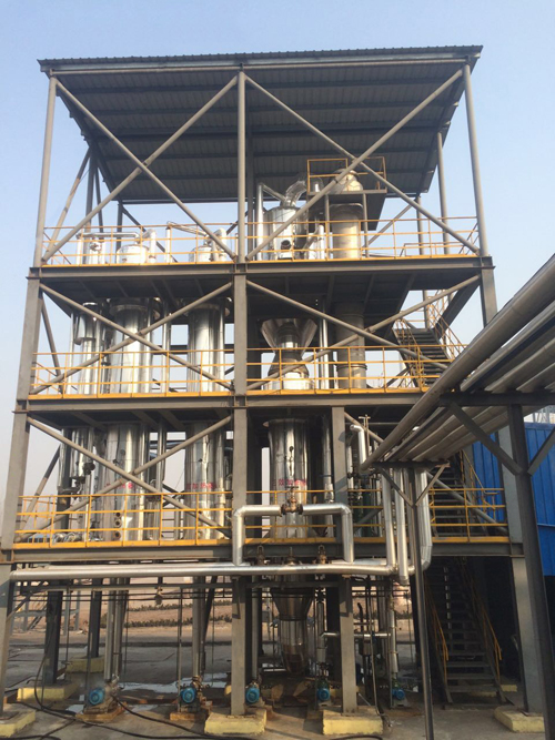 乙醇廢水溶液蒸發結晶器是由相互串聯的三個蒸發器組成,低 溫(90℃左右)加熱蒸氣被引入一效,加熱其中的廢液,產生的蒸氣被引入二效作為加熱蒸氣,使二效的廢液以比一效低的溫度蒸發,這個過程一直重復到三效。一效凝水返回熱源處,其它各效凝水匯 集后作為淡水輸出,一份的蒸氣投入,可以蒸發出水出來。同時,高鹽廢水經過由一效到三效的 依次濃縮,在三效達到過飽和而結晶析出,由此實現鹽分與廢水的固液分離。