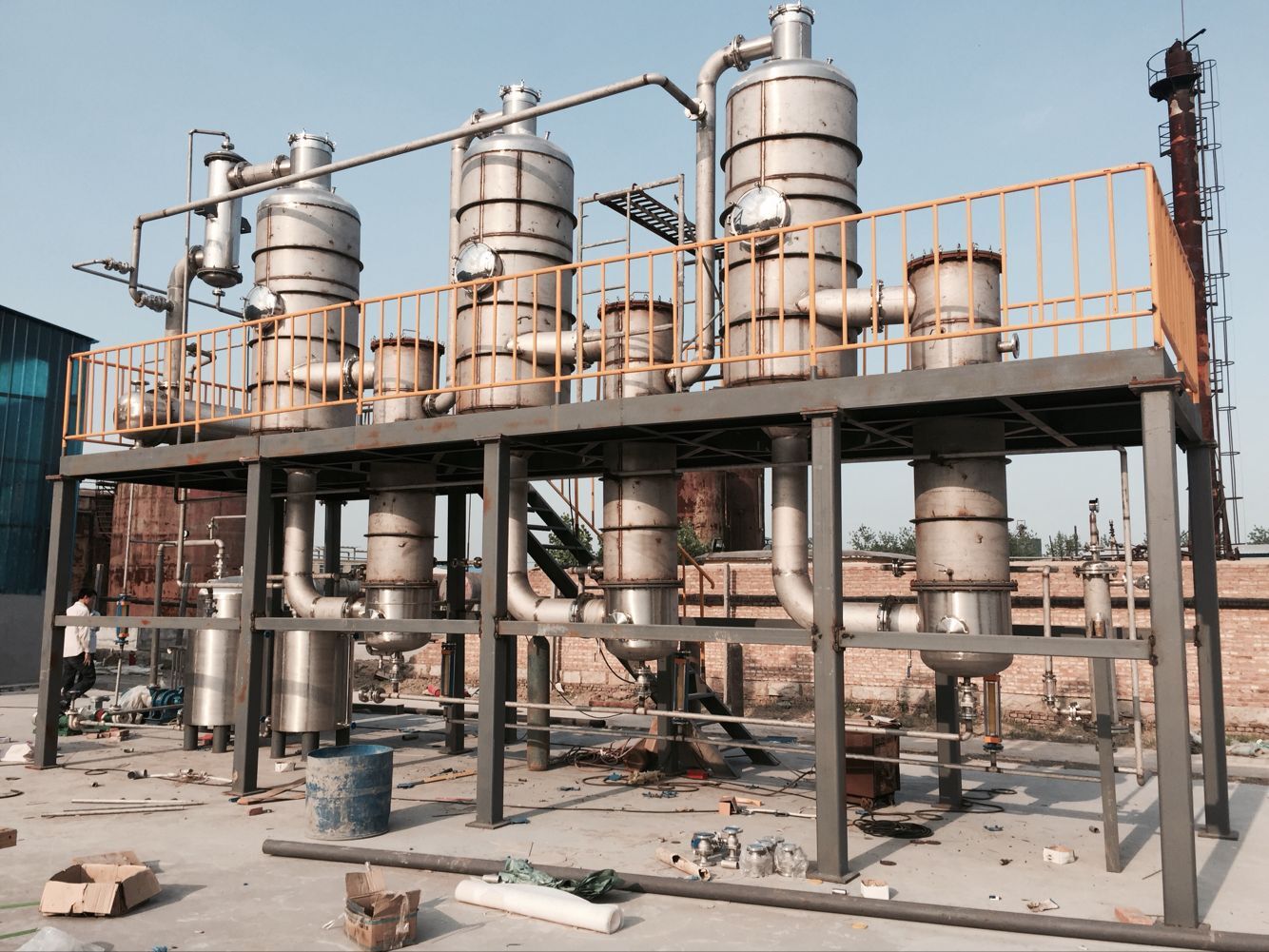 雙效蒸發器簡單的說就是兩個單效蒸發器串聯在一起,串聯的方式又分為并流、逆流、平流三種形式。加熱蒸發器、分離器、冷凝器、熱壓泵、保溫管、真空系統、料液輸送泵、冷凝排水泵、操作平臺、電器儀表控制柜及閥門、管路等系統組成。