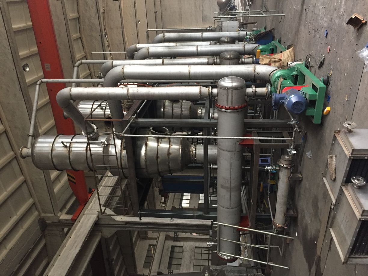 雙效蒸發器簡單的說就是兩個單效蒸發器串聯在一起,串聯的方式又分為并流、逆流、平流三種形式。加熱蒸發器、分離器、冷凝器、熱壓泵、保溫管、真空系統、料液輸送泵、冷凝排水泵、操作平臺、電器儀表控制柜及閥門、管路等系統組成。