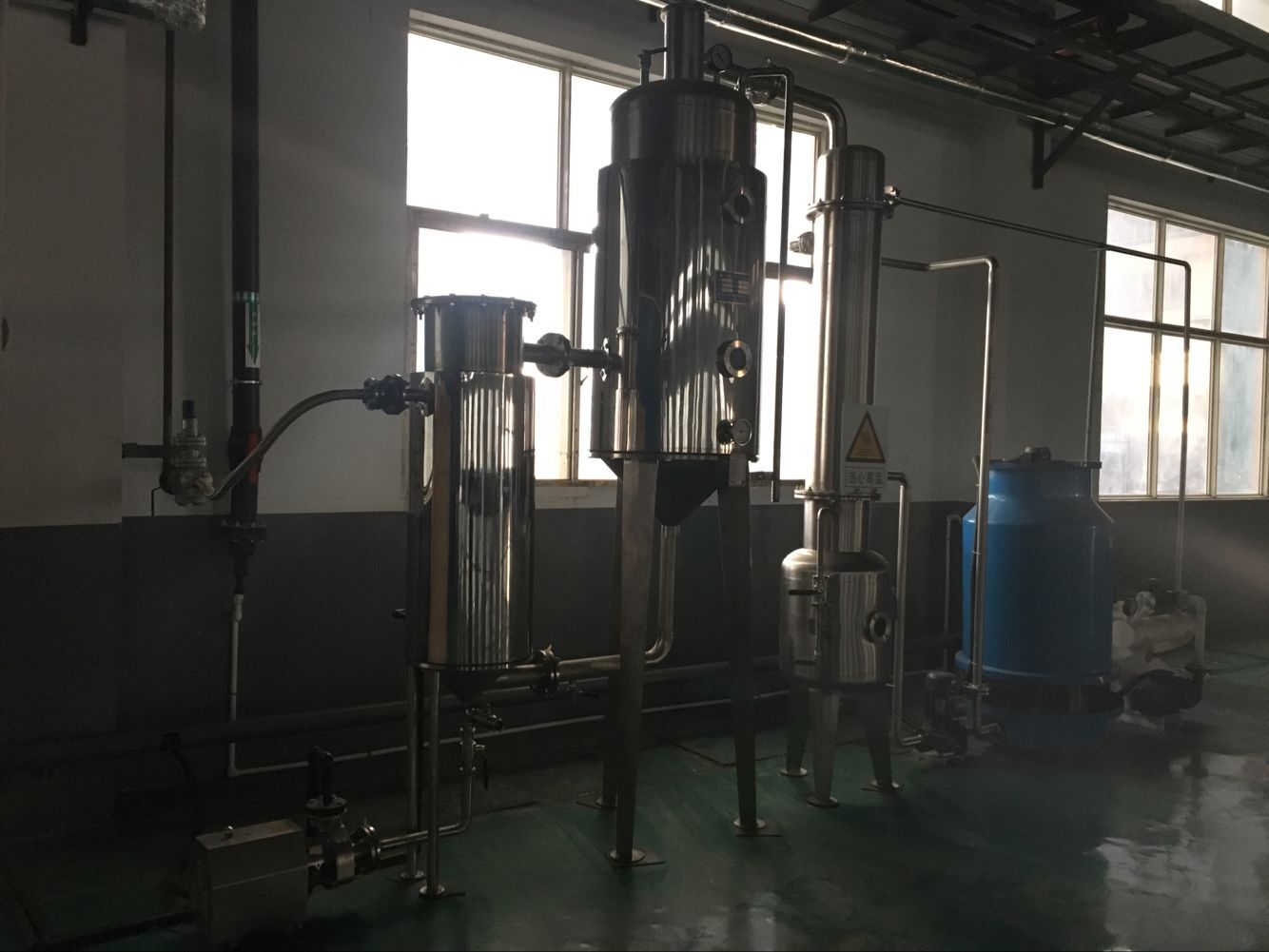 6.對于食品蒸發濃縮,設備可同時具備功能,物料先經預熱,達到94度以上,維持24秒左右,即進入一效效體,物料迅速閃蒸,溫度瞬間下降。